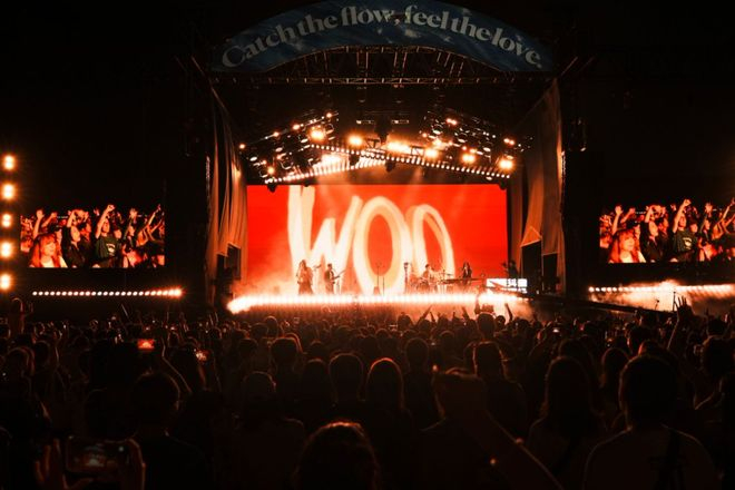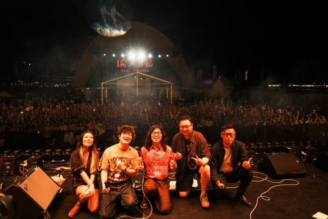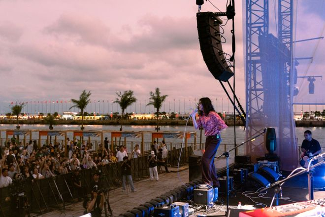 曲目编排亦与自然光线的变化精密契合:伴随夕阳渐落,以《有暖气》《一次成像》等温润抒情的作品,织就轻松惬意的情绪;暮色初启,《Moon Rock》《Orange Ocean》让现场渐入澎湃;当夜幕完全降临,《起床气》《Vodka》等更具张力的作品接连登场,配合灯光与焰火,将全场情绪推至顶点。乐队与观众在霓虹闪烁的夜色海景中随着音乐同频共振。
