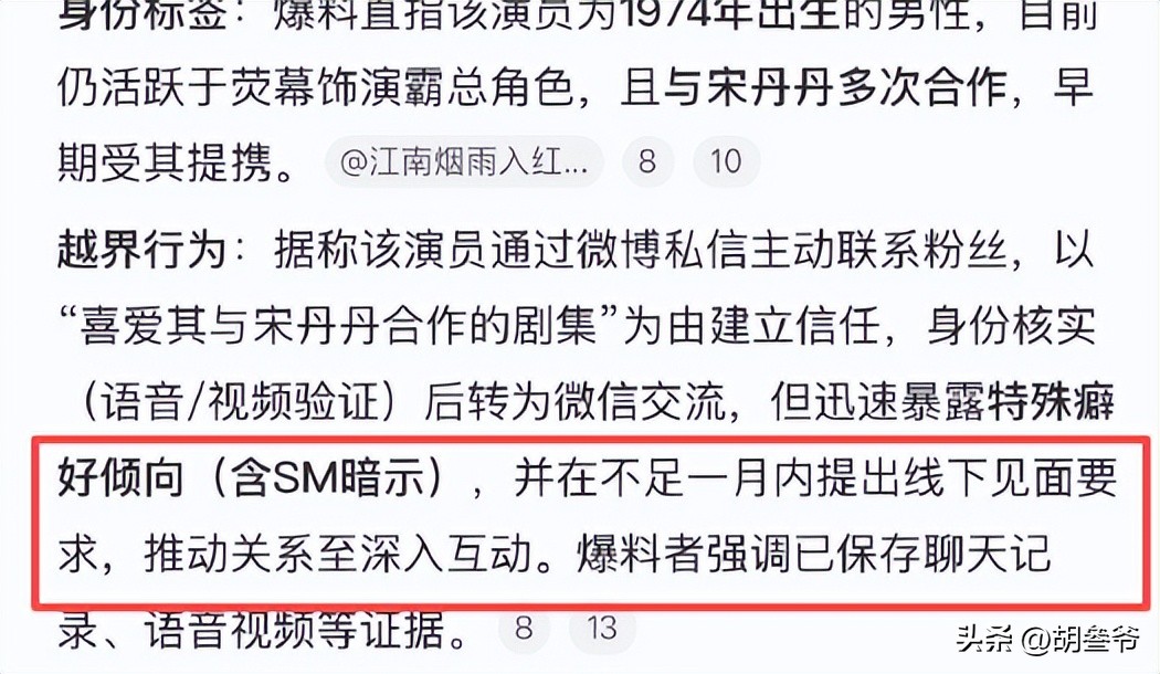 据悉,一位1974年出生、常年演霸道总裁还和宋丹丹多次合作的男演员,被指主动私联粉丝。