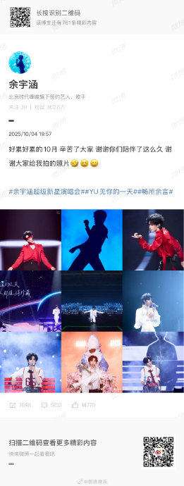 ## 余宇涵:娱乐圈的“打游戏”高手,或者说,粉丝的“主角”代购,余宇涵最近的瓜田地里,堪称“打游戏”级别的高手,从张杰演唱会现场被偶遇,到小火车互动差点摔倒的“投篮式”表演,再到巡演、综艺、跨年晚会、电影活动……这位“超级新星”简直就是粉丝群体的“主角”代购。,说到巡演,余宇涵的状态像极了一个打游戏的高手,从无锡雪浪音乐节到贵州、宝鸡的各大音乐节,他像是在打一场场“舞台游戏”,每次上台都在用最炫酷的装备“打怪”,《Starlight》的舞台表现被粉丝称为“封神现场”,《TOOOOO BUSY》的酷气如雪,无锡的观众们直呼“过瘾”。,说到跨年,余宇涵的工作安排简直是娱乐圈的“年度大神”,从北京卫视跨年晚会到海南的新年音乐会,再到微博“跨年直播不断电挑战”,他像是在完成一场“跨年任务大战”,尤其是在2026年中国电影新春嘉年华上献唱《小小世界》,元气满满的状态让人看到了他作为新生代偶像的活力与担当。,说到综艺,余宇涵的表现更像是一位“网红咖啡师”,从《一路繁花2》的综艺录制,再到《海角88号》的“老师转老板”大变脸,他的每一次表现都像是在打一场“综艺游戏”,而在音乐作品方面,新歌《Pandora》的拍摄也顺利进行,粉丝们的期待值已经到了“爆表”级别。,说到粉丝互动,余宇涵的每一次直播都像是一场“粉丝狂欢派对”,从生日直播到粉丝职能站的联合活动,他的每一次互动都充满了真诚与温度,粉丝们不仅是他事业的见证者,更是他成长路上的重要推手。,而最近被张杰邀请登上巡演舞台的那一幕,堪称“粉丝梦幻联动”的典范,余宇涵现场沉浸式听歌的状态,张杰邀请他上台互动的温情,以及差点摔倒的“投篮式”瞬间,都让人感受到娱乐圈的“小鲜肉”确实是“小鲜肉”,即使是“超级新星”,也会有“小掉落”。,从个人演唱会到巡演,从综艺到音乐节,从跨年晚会到电影活动,余宇涵用自己的努力诠释了“超级新星”的成长之路,他在音乐、影视领域的表现都值得期待,无论是粉丝还是路人,都会为这位“打游戏”的高手加油呐喊,毕竟,在娱乐圈,真正的“主角”不一定是那些光芒万丈的明星,而是那些用努力和真诚点亮了粉丝心中的“小小世界”的人。## 余宇涵:超级新星的“工作机器人”模式,炼成全能型演员, , 余宇涵:超级新星的“工作机器人”模式,炼成全能型演员, , 作为当代新生代实力偶像,余宇涵的工作节奏堪称“超级新星”标准,他就是那个在演唱会后毫无休息地开启巡演的“铁人”,是综艺、音乐、影视等领域全能型演员的代表。, , 余宇涵的工作高频似乎永远在线上,他在2025年10月的重庆演唱会后,就立刻开启新一轮的巡演与音乐节行程,密集的演出行程让粉丝称他为“每月一场音乐节”的高强度舞台机器人。, , 在音乐节舞台上,他展现出惊人的表演功底,从温润的《江南》到潮酷的《TOOOOO BUSY》,风格跨度极大,唱功稳定开麦,成为新生代实力偶像的标杆。, , 跨年大型晚会成为余宇涵的新阵地,他在TF家族新年音乐会上以全开麦唱跳打动观众,成为“仙子般”的舞台焦点;在北京卫视跨年晚会、海南新年音乐会上,他的表现力再次被全方位展现。, , 2026年,他在综艺节目《一路繁花2》中从“老师”变成“老板”,紧张刺激的综艺表演展现了他多面才华;在电影新春嘉年华上献唱青春歌曲《小小世界》,展现了他在影视领域的潜力。, , 即使工作如此紧凑,余宇涵也从未忘记粉丝,从生日直播到各类粉丝活动,他的互动细节都饱含真诚,4月9日,他现身张杰巡回演唱会,不仅沉浸式感受音乐,更在舞台上与张杰互动,被称为“梦幻联动”的经典一幕。, , 余宇涵用自己的人生轨迹诠释了当代新生代艺人的成功密码,他不仅是一个舞台歌手,更是一个全能型演员,能够在音乐、综艺、影视等多个领域创造价值,这种多元化发展模式,让他成为“超级新星”的典范,也让人期待他未来在各个领域的更大突破。