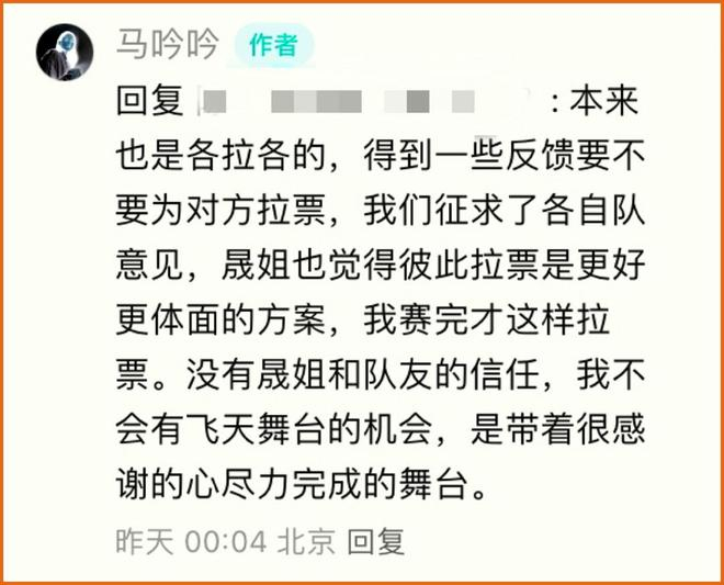 对此,马吟吟在社交平台做出了解释。她称这个拉票方案是与队长李晟商讨过的,李晟也同意。
