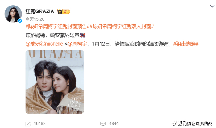 此次二人梦幻联动,共同为《红秀》拍摄封面,无疑是一次风格与魅力的碰撞。蝶的意象,或许暗示着他们在拍摄中展现出的蜕变与新生,将以全新的视觉形象带给大家惊喜。粉丝们纷纷表示,从预告就能感受到画面的唯美与浪漫,已经迫不及待想看到 1 月 12 日正式发布的封面,见证这场温柔邂逅的破茧瞬间。相信这组封面照将会在时尚圈和粉丝群体中引发热烈反响。