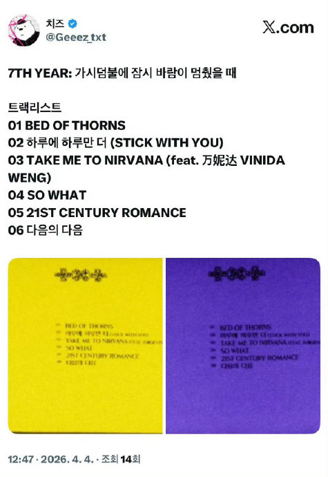 2026年4月13日,TXT将发行第七张韩语专辑《7TH YEAR: A Moment of Stillness in the Thorns》(荆棘丛中暂息的风),其中第三首英文单曲《Take Me To Nirvana》的曝光歌单赫然标注“FEAT. 万妮达 VINIDA WENG”。专辑共收录6首曲目,包含迷幻电子、流行摇滚等多元风格,而万妮达的加盟成为最大亮点。此举被视为TXT继MV启用中国模特后“专注创中”战略的延续,也是万妮达首次与K-pop男团合作。尽管双方尚未正式官宣,但多家权威娱乐账号及粉丝发布的歌单高度一致,真实性引发广泛期待。