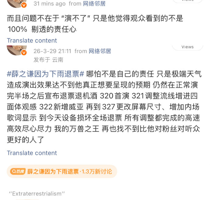 注:3月28日薛之谦曾发文悼念逝去挚友张雪峰,暂未影响演出行程。