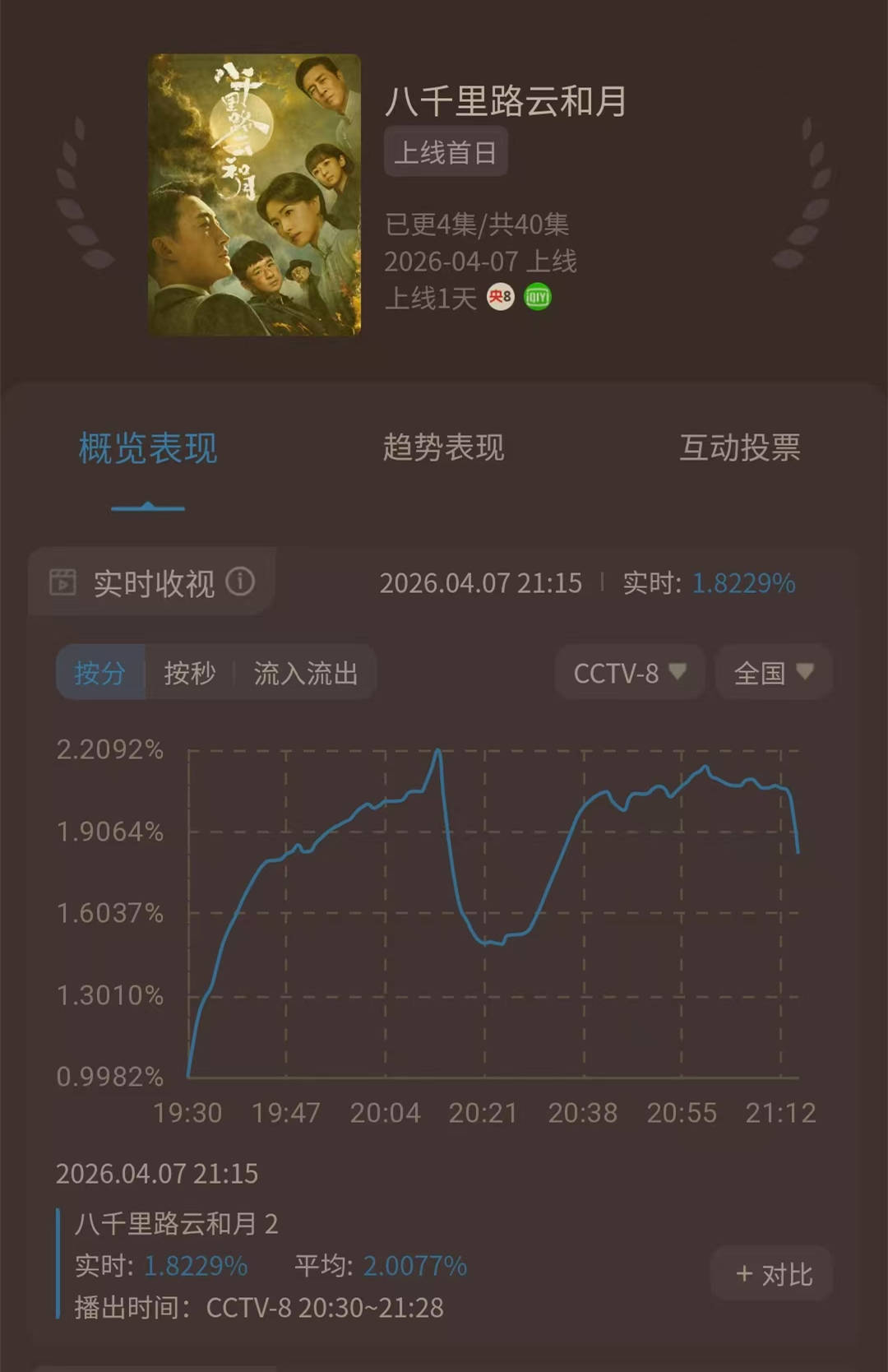 《八千里路云和月》开播之后,第一集的峰值收视率只有2.2092%,第二集的收视率没有超越首集的峰值。这是酷云实时的数据。这个数据,放在央八的首播剧作品当中,则非常一般。以往情况之下,抗日题材的电视剧,都有着非常不错的收视表现力。而这部《八千里路云和月》则反其道而行之,收视率很是一般。