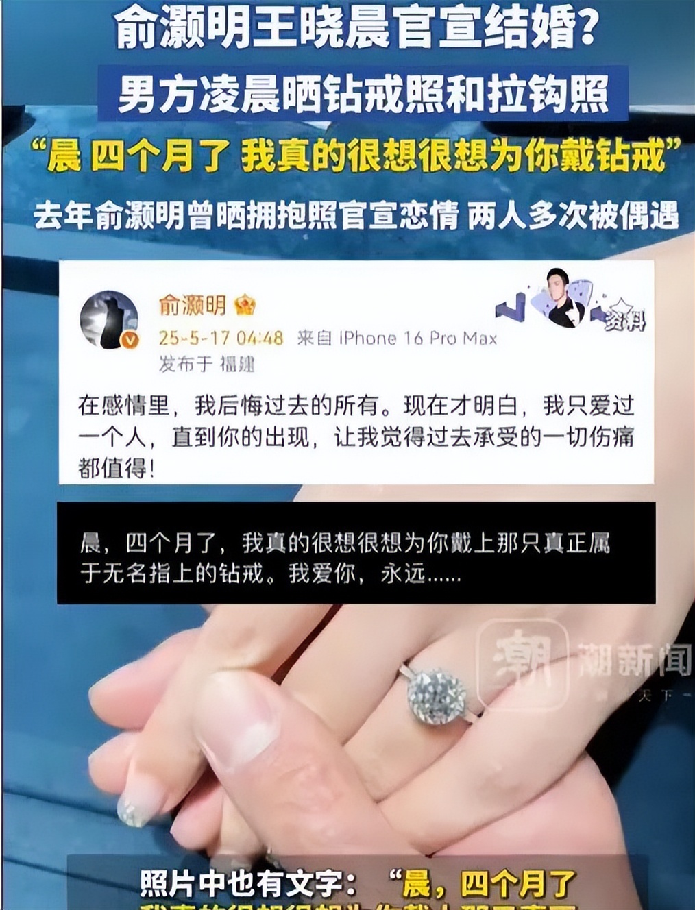 之后俞灏明的示爱,更是越来越高调,2025年5月,他直接晒出婚戒和两人拉钩的照片。