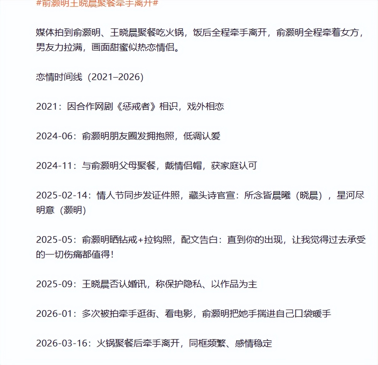 【1】2026年4月14日发布 潍坊传媒《4月14日(报道)王晓晨疑似内涵俞灏明,发文称因服用“不合适的药物”突发心悸,感叹“日子怎么会和谁过都一样”,此前二人多次被拍到亲密同行!”》