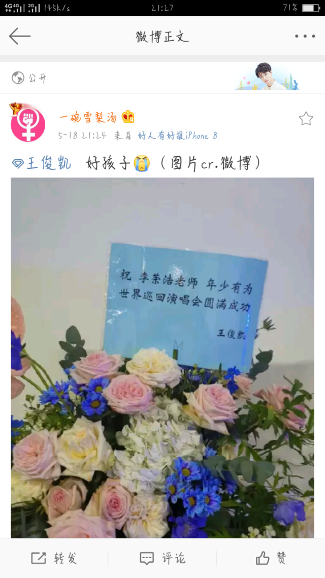 王俊凯真的是一个超级好孩子,在前辈巡回演唱会上献上鲜花预祝圆满成功!真是全世界最好的小朋友了,尊敬前辈,热爱音乐,优秀!