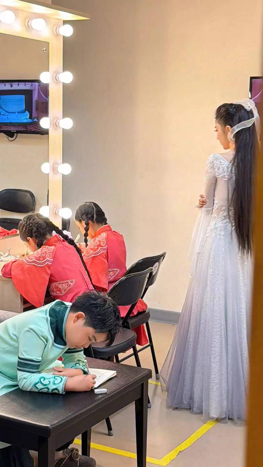 佟丽娅带两个孩子演戏,不忘提醒他们完成作业,看来佟丽娅一手抓表演,还一手抓作业,真是全能老师,舞蹈表演很厉害,还能让孩子们默写生字。两个小女生坐在一起,朵朵一个人坐在小桌子上,戏服都没有换,居然开始默写了。