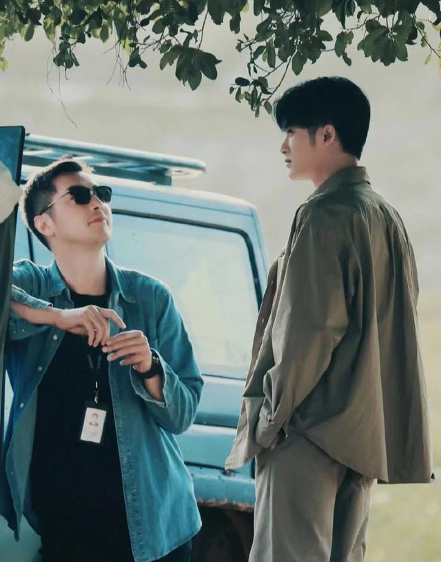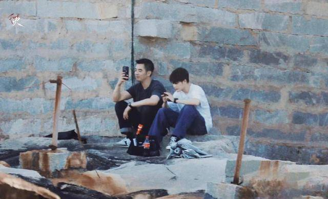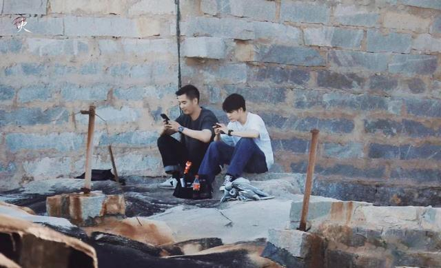 在没有戏的时候,两人蹲在墙壁的一角玩手机。檀健次的身旁还放着一把雨伞,看上去像是两个结伴出游的少年。