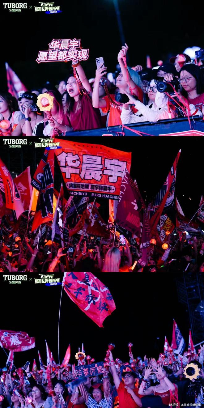 另一面,歌迷们也同样准备了用心的应援,数百面旗帜,超大灯牌排字告白,火星能量棒汇聚的灯海……不少粉丝提前策划,甚至跨越半个中国远道而来,只为给华晨宇最完美的应援!