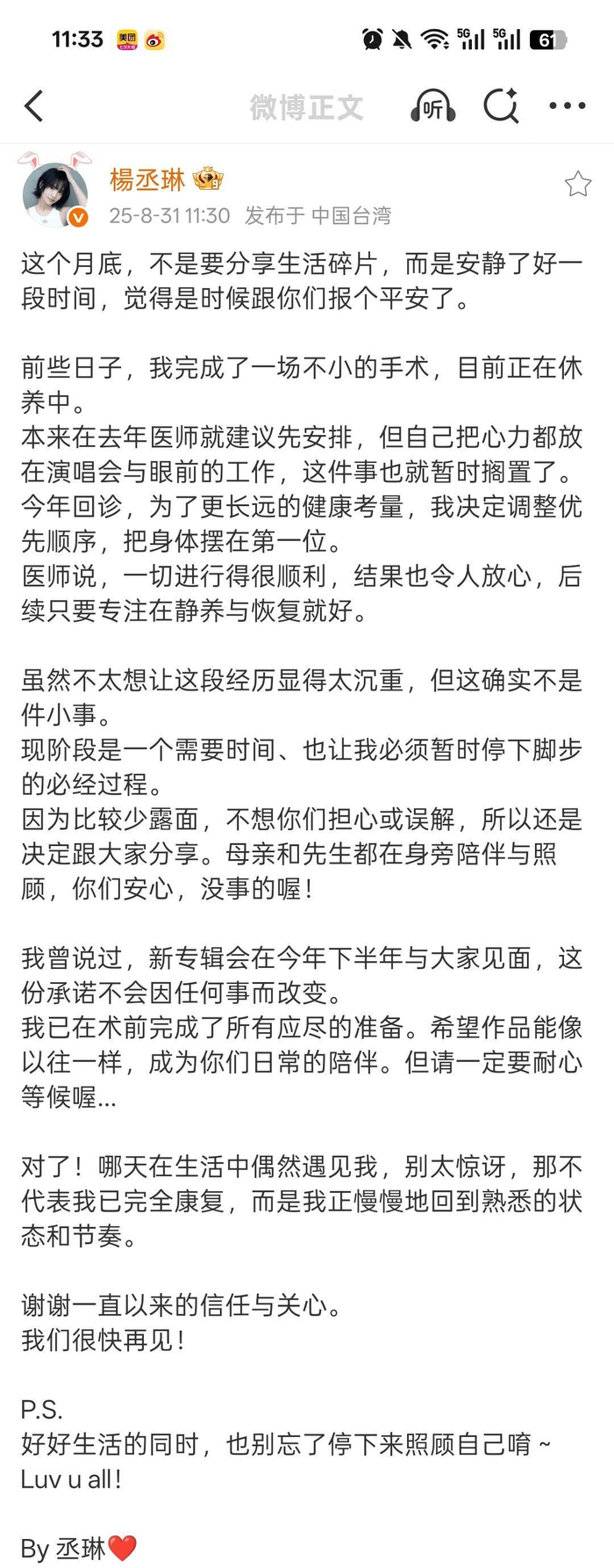 不管过去多久,还是会被杨丞琳这一篇长文而感动。