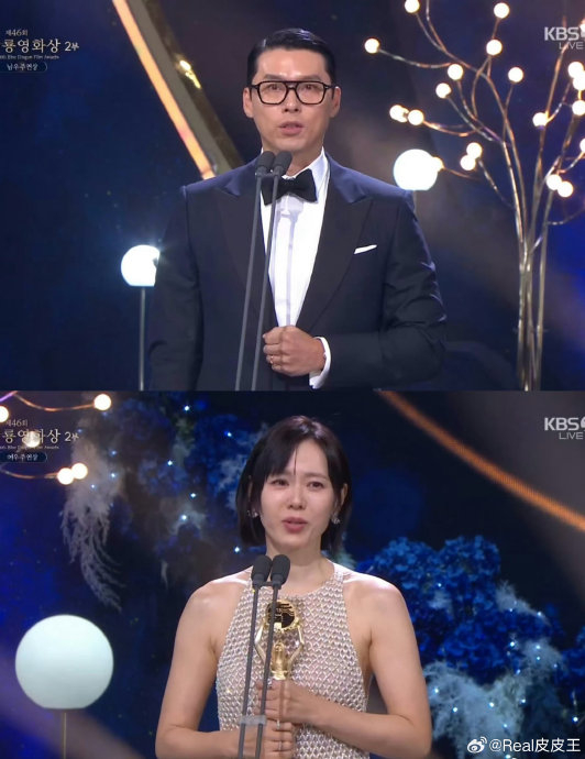 玄彬凭借谍战片《哈尔滨》中饰演的安重根将军首夺青龙影帝,其深沉演技塑造了历史人物的悲壮感;孙艺珍则在朴赞郁导演的黑色喜剧《无可奈何》中以突破性母亲角色二封青龙影后,该片横扫包括最佳导演、最佳影片在内的六项大奖成当晚最大赢家。更值得铭记的是,两人创下青龙奖46年历史上首对夫妻同届包揽表演最高奖的纪录,韩国媒体以"电影般的瞬间"形容这场盛况。