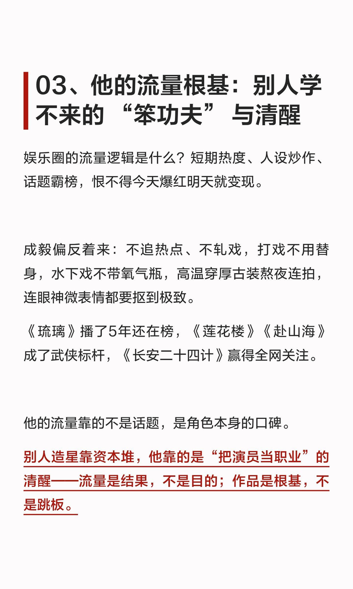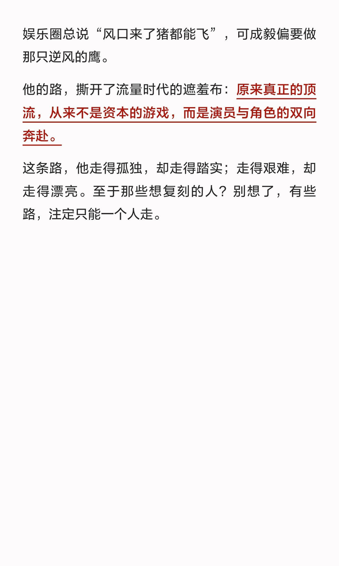 成毅15年蛰伏,极致自律,全网黑淬炼,用100%投入和敬业打破流量逻辑,凭借角色质感和作品口碑成为顶流,证明真正的流量是演员与角色的双向奔赴,绝非捷径可复刻。