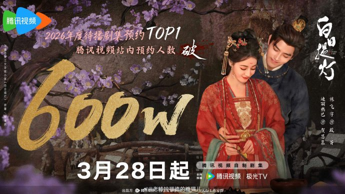 2026年3月28日,古装奇幻剧《白日提灯》于腾讯视频正式开播前,以双端预约量超653万的惊人数据刷新平台年度纪录,登顶待播剧热度榜首,其相关短视频话题在抖音的播放量更突破40亿,成为影视市场罕见的“未播先爆”现象级案例。