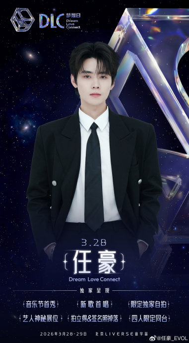 在2026年3月28日的“DLC梦想日”音乐现场,任豪以一场精心编排的舞台为观众献上了包括新歌首唱与经典重制曲目在内的多元表演,其中已明确公开的曲目为《荒芜雪地上的一棵树》和新版《喜欢你》,而其他舞台内容则被官方以悬念形式保留至演出揭晓。