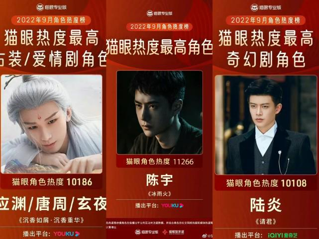从猫眼数据上看,九月份角色热度前十名的有王一博饰演的陈宇、任嘉伦饰演的陆炎、成毅饰演的应渊、王鹤棣饰演的东方青苍等。