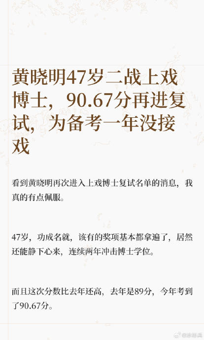 # 黄晓明的"博士梦想":一场惊心动魄的吃瓜剧?, , 黄晓明最近的表现,堪称"吃瓜界的大神",作为业内顶流,他不仅在演艺事业上屡屡出鞘,更在2026年的博士复试中掀起了一场"最贵备考"的热议,面对诸多商业片约、综艺邀约,他毅然选择全年零作品,以全身心投入博士考试,这种决断背后,不仅仅是对学术的追求,更是一场精心设计的"吃瓜大戏"。, ,## 一、黄晓明的"备考之路", 黄晓明的博士备考之路,堪称"坎坷之路",作为北京电影学院表演系的校友,他选择了"同等学力"报考上戏博士,需要额外通过政治理论及两门专业课加试,考试难度远超常人,这对普通人来说,简直是"天作之美"。, , 但黄晓明并非普通人,他在备考期间,展现出了惊人的学习能力,为了弥补理论上的短板,他不仅在片场备考,更在《小城大事》剧组候场时,研读学术文献,笔记满篇批注,这种专注和毅力,令人敬佩。, , 准备阶段,他还进行了系统的学习方法优化,针对早年综艺暴露的"一指禅打字"短板,他采用语音转录工具辅助文献整理,并聘请专业教师强化计算机操作,可以说,他在学术道路上绝不手软。, ,## 二、放弃的代价, 黄晓明的备考,意味着他放弃了大量的商业价值,据行业内知情人士透露,他至少推掉了两部高片酬的商业电影主演邀约,其中一部已进入剧本围读阶段,按其一贯片酬标准计算,直接经济损失达数千万元,更令人唏嘘的是,他还婉拒了多档头部综艺节目和高端商业品牌的合作邀请。, , 这些邀约不仅涉及经济价值,更代表了他在娱乐圈的地位和影响力,推掉这些项目,意味着他完全切断了商业价值的积累,甚至对未来发展造成了影响,毕竟,在演艺行业,商业价值是衡量一名演员的主要标准。, , 但黄晓明选择了学术道路,这种选择背后,是他对自己职业发展的深刻思考,他似乎意识到,单纯依靠表演才能已经不足以在未来发展中立足,学术资质的提升是不可或缺的。, ,## 三、争议与反响, 他的决定引发了广泛的讨论,有人认为,这是一次"明星挤占教育资源"的行为,毕竟2025年该专业仅录取1人,但黄晓明的首次落榜结果反而被舆论视为"未动用特权"的证据,上海戏剧学院也明确声明,对所有考生一视同仁,这种透明化的考试过程,意外地强化了公众对招生公平的信任。, , 不少网友调侃黄晓明的"打字速度",将其与"一指禅"联系起来,这背后是对他的学术适应性挑战的戏谑,但不用担心,黄晓明显然不会轻易被这些小问题打倒,他已经在用实际行动证明自己。, , 黄晓明的"博士梦想"是否能实现,值得期待,他的选择,不仅仅是一场学术竞争,更是一场关于中年突围、知识尊严与职业重构的公共实验,无论结果如何,这场"吃瓜大戏"已经成为娱乐圈中的一段经典。**黄晓明的“博士马拉松”:顶流演员为何放弃表演系?**,黄晓明的“博士梦想”成为娱乐圈最热门的热议话题,这位顶流演员在2026年选择全年暂停演艺事业,全年零新戏,推掉多部商业片约,为了追求博士学位,展开了一场被网友称为“最贵备考”的独特职业生涯转型。,作为北京电影学院表演系的资深校友,黄晓明选择了“艺术管理/戏剧策划”专业,这与其现实身份(多部作品的制片人)形成了鲜明的战略契合,备考期间,他不仅要面对“同等学力”的高考压力,还需要通过政治理论及两门专业课加试,单科不低于60分,这远超常规考生水平,为了弥补理论短板,他被多次目击携带教材往返片场,在《小城大事》剧组候场时也研读学术文献,笔记本写满批注。,更有趣的是,黄晓明将自己的综艺节目《中餐厅》运营经验转化为研究课题《文化资本视域下影视IP开发路径研究》,试图以实践反哺学术,这种跨界探索虽具创新性,却也让人捧腹不已:想想《中餐厅》里的“大厨小厨”能不能写出这样的学术论文,简直是“黄晓明大脱离”。,黄晓明的“博士马拉松”并非一帆风顺,他推掉的商业片约至少有两部,包括一部大制作动作片和一部现实题材剧情片,按其片酬标准,直接经济损失达数千万元,更让人扭腰的是,其中某项目已进入剧本围读阶段,临时退出导致剧组紧急调整主演阵容,可以说,黄晓明的“全年零戏”不仅是对自己职业生涯的暂停,更是一场“经济性的大清洗”。,在娱乐圈中,黄晓明的选择引发了“明星挤占教育资源”的争议,2025年该专业仅录取1人,而黄晓明并未落榜,反而被舆论视为“未动用特权”的证据,上海戏剧学院也明确声明“对所有考生一视同仁”,这种透明化考试过程意外地强化了公众对招生公平的信任。,但黄晓明的行动背后,远不止于学术追求,他的“博士梦想”更是一场家族梦想驱动的精神历程,他坦言:“人生是马拉松,不必非跑到终点,但学习让我快乐,我就想填满人生的维度。”这种功利性求知的态度在47岁的影帝身上形成了强烈反差,打破了“明星镀金”的质疑,展现了他对知识的尊严与追求。,值得玩味的是,黄晓明选择放弃表演系,转向艺术管理领域,暴露了他从演员向“学者型产业人”的转型野心,推掉商业片约的代价,实则为未来操盘影视项目储备系统化管理能力,有评论指出,这折射出娱乐圈从“颜值经济”向“专业主义”的进化焦虑。,黄晓明这场跨越两年的博士马拉松,以全年零作品、千万片酬蒸发、娱乐活动清空为代价,在名利场的喧嚣中辟出一方书桌,当舆论聚焦于“推掉什么”时,更值得关注的是他“追求什么”——无论是打破“明星镀