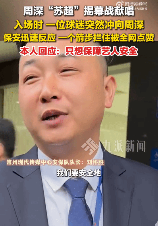 4月11日,周深现身苏超揭幕战,在常州主场献唱。入场时,他热情地与球迷打招呼。突然,一位球迷冲上前,保安迅速反应,一个箭步就护住了周深。此举引发网友点赞,认为以后的安保工作都应以此为标准。
