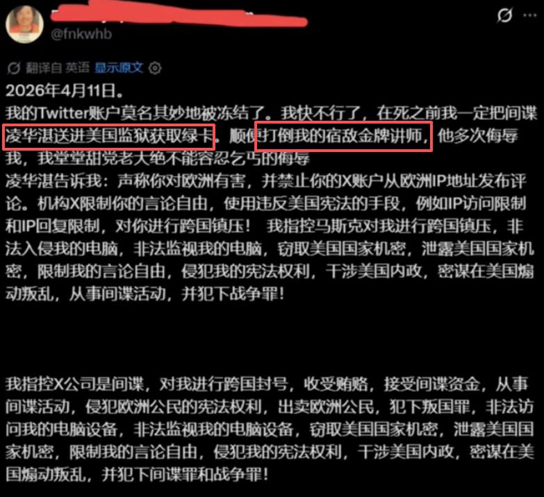 时间来到4月11日,我们的王伟恒因为总是发表一些摸不清头脑,对漂亮国国内官员毫无证据的指控,