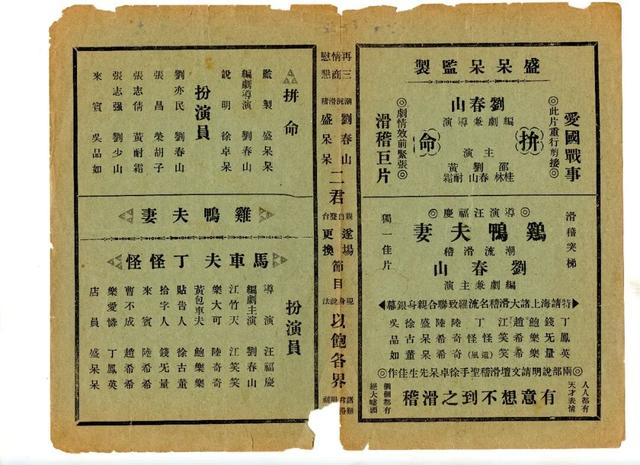 1937年“八一三”炮声响起,日本军队侵占租界,参加电台抗日募捐播音的刘春山、张冶儿、“江鲍档”等上了黑名单,日军“电监处”严密控制电台广播,全市所有短波收音机均送查拆除,堂会被视为非法聚会遭遇取缔,滑稽演员失去挣钱地盘,只能依靠救亡协会发给米粮维持生计。直到1941年,剧场演出再度兴起,以“滑稽大会串”形式排演的首部整本大戏《一碗饭》,讽刺囤积居奇的米店老板,同情衣食无着的下层人民,引起市民同声相应,一时票房翻红。