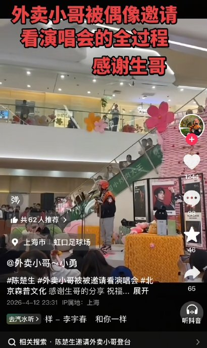 2026年4月6日,上海凯德虹口商场举办陈楚生歌迷预热活动。人群中,一位身着外卖制服的小哥放下保温箱,举手高喊“我可以吗?”,随即背起吉他登台。未施粉黛,不修音准,他指尖流淌出《有没有人告诉你》的旋律,沙哑声线裹挟着异乡人的孤独与倔强。曲终,他匆匆跨上电动车没入人海,只留下短视频以“外卖届陈楚生”之名席卷网络。