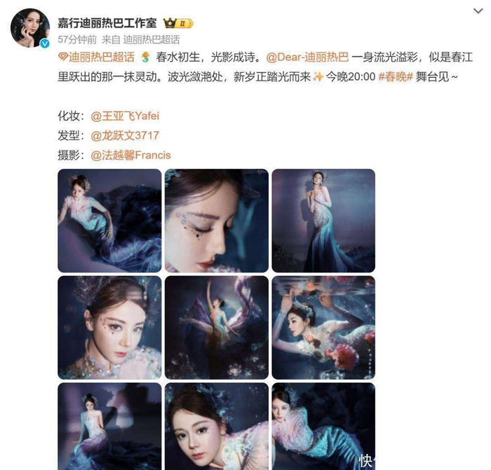 2月16日,除夕夜,迪丽热巴将亮相中央广播电视总台《2026年春节联欢晚会》的宜宾分会场。她的工作室——嘉行迪丽热巴工作室,专门发布了她今晚的造型照。图中,迪丽热巴身着一袭流光溢彩的衣服,仿佛一位从海洋深处而来的美丽人鱼公主,带着星光踏浪而来。如此动人的造型,不禁让人期待她在春晚舞台上的表现!