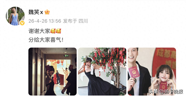 26日,魏笑在其个人账号发文,官宣结婚:谢谢大家,分给大家喜气。