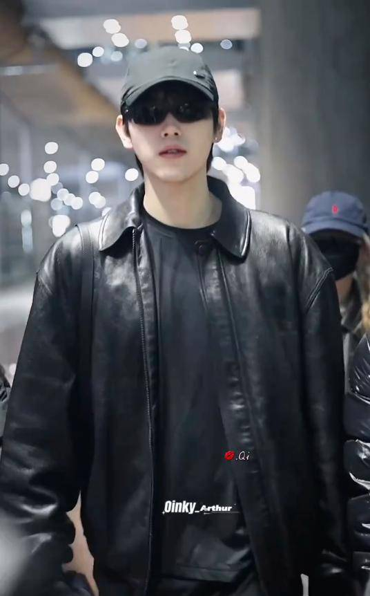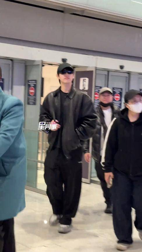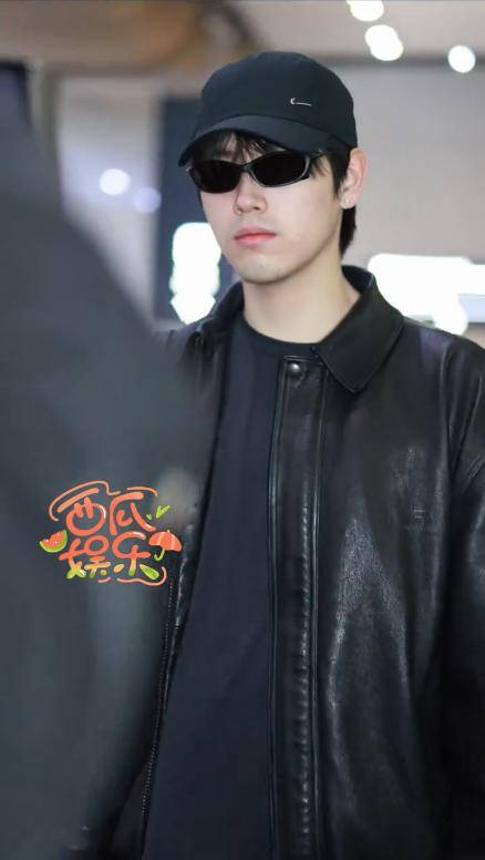 那天,他穿着一件黑色粒面皮衣,皮质的亮面在灯光下折射出高级的光泽,简约而不失气场。黑色高领拉链设计干净利落,内搭一件黑色打底衫,稍微露出一点点衣边,巧妙地中和了皮衣的硬朗感,整体看起来不那么锋利。下身搭配了黑色牛仔裤和同品牌的老爹鞋,整个造型一黑到底,简洁又充满张力。