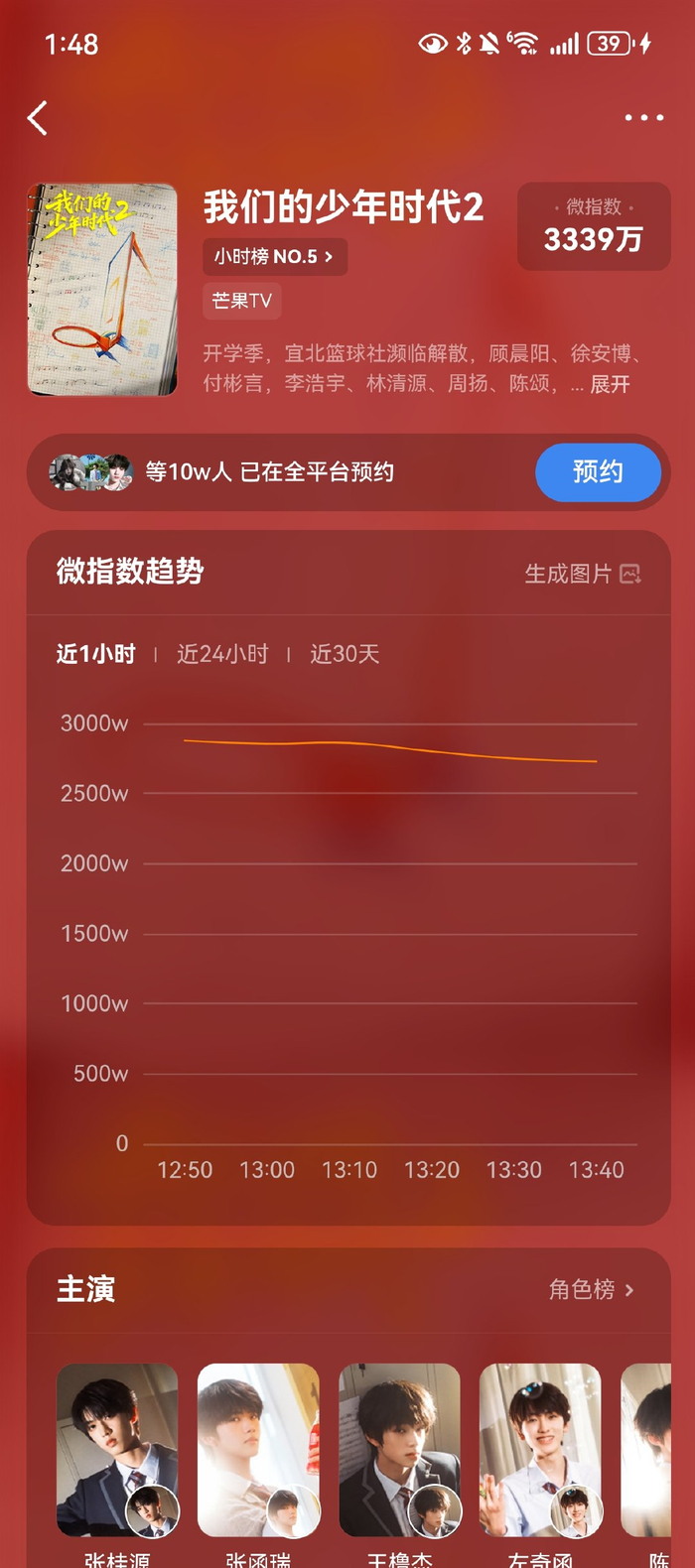 【#我们的少年时代2预约量破10万# 你最期待谁?】由@TF家族-张桂源 @TF家族-张函瑞 @TF家族-王橹杰LJW @TF家族-左奇函 @TF家族-陈奕恒Jonathan @TF家族-杨博文YBW @TF家族-陈思罕_SH @TF家族-陈浚铭chen (排名不分前后,按年龄大小排序)等主演的《我们的少年时代2》,目前,该剧在微博剧集热度指数待播榜预约量已破10万。该剧以“篮球+校园乐团”双线叙事,讲述少年们挽救宜北中学篮球社、共建秘密基地的青春成长故事。