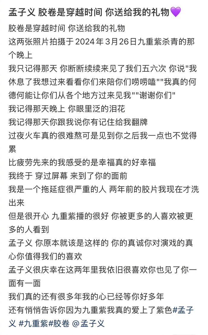 粉丝分享了24年3月26日拍摄的孟子义九重紫杀青胶片照,好有意义的两张胶片🥹