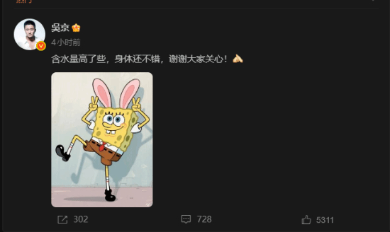 对此,吴京今日就网友对其面部“慢回弹水肿”的担忧作出幽默回应,称“含水量高了些,身体还不错,谢谢大家关心。”,配图则是海绵宝宝,呼应了网友之前的调侃。