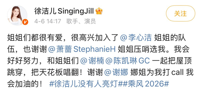#徐洁儿回应没有人亮灯#徐洁儿姐姐回应没有人为她亮灯,感谢心洁姐姐的选择,期待你和李心洁谢楠陈凯琳的舞台#乘风2026#