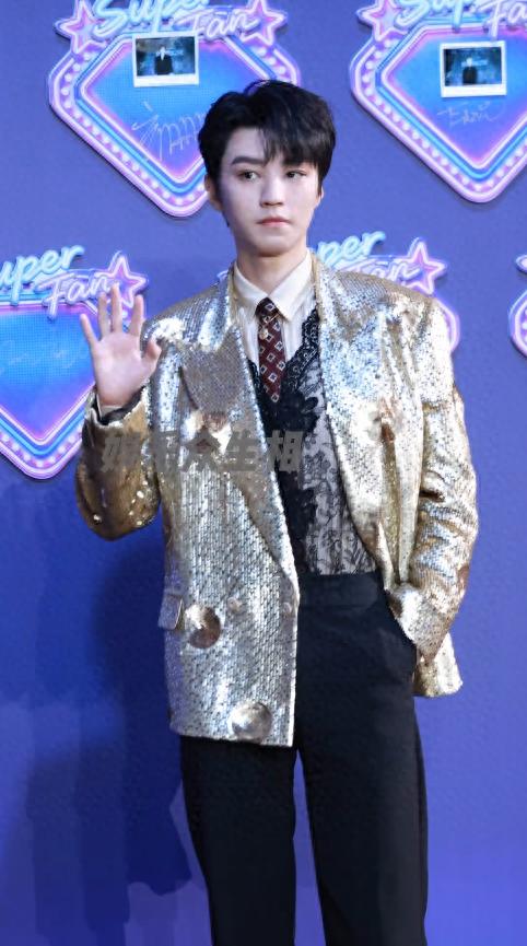 王俊凯穿了一身金色亮片西装,搭配一条暗红色领带,领口处还别了一枚银色胸针,单看款式,贵气十足,符合他压轴的身份。