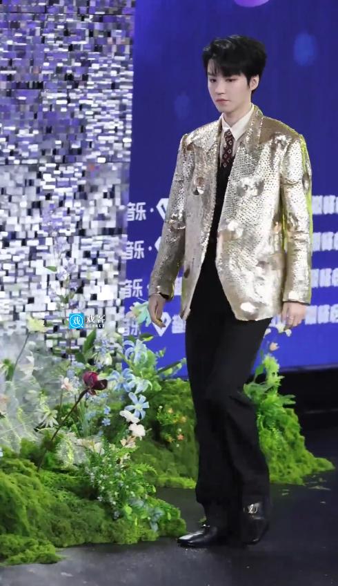 金色亮片材质格外反光,在现场灯光的照射下,显得格外浮夸,不仅不上镜,还把他的身形拉得有些臃肿。