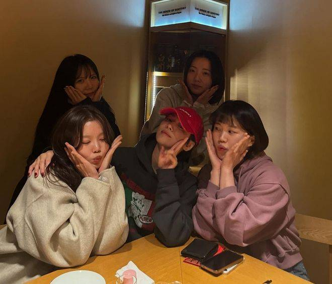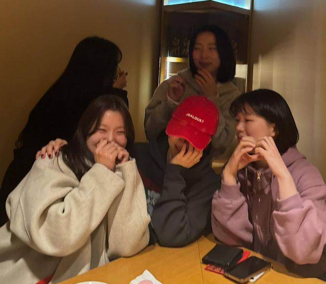 此外,宋慧乔还分享了与几位女同事的合影。她们围坐在餐桌旁,互相交谈着,笑声充满了整个画面。那种无拘无束的亲密感,仿佛能让人感受到她们之间的深厚友谊。大家的笑容都如此自然,眼中闪烁着幸福的光芒,气氛轻松愉悦。