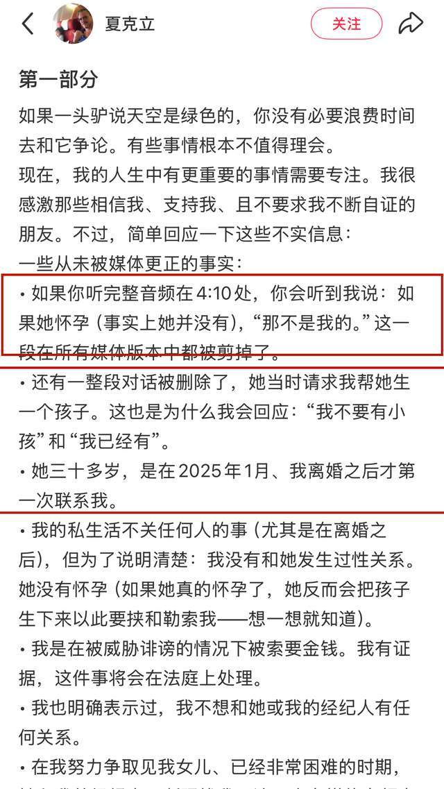 夏克立在回应中提到了两个关键点,第一便是:如果她怀孕(事实上她并没有),那不是我的。