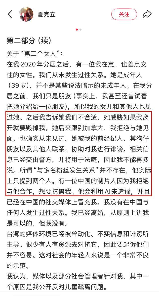 题外话就是夏克立已经官宣再婚生女,不过关于第二任妻子的身份,他并没有透露。