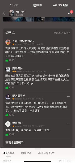 ## 白日提灯:流量明星与古装剧的悲剧交响曲,《白日提灯》开播48分钟,就被一场前所未有的口碑风波撕裂了,豆瓣短评区的异常差评如同一把锋利的刀,劈开了这部剧集温热的表面,暴露了中国网络文化的深层悖论。,这场口碑战役的导火索,是迪丽热巴和陈飞宇这对"顶流明星"的古装演绎,观众们用"姨侄恋"、"奶孙恋"等词语,调侃这对"CP"的年龄差异,仿佛在演绎一部荒诞的"奶孙爱情"剧,更有甚者,网友们将剧中的服化道过度修图称为"五官去世",演员们的面容被描绘得近乎抽象化,宛如一幅"白画",这场"美学大洗礼",折射出现代审美观的异化与困境。,豆瓣短评区的异常差评事件,更是将这场口碑风波推向了一个新的高度,超200条的一星评分集中出现,观众们用近乎模板化的评论,将"姨侄恋"、"磨皮滤镜"等关键词轮番抛出,这不仅是一场简单的口碑战,更可能是一场暗藏的商业博弈,律师指出的,如果这些评分是有人精心操控的,就可能触犯《反不正当竞争法》,这场风波的背后,隐藏着互联网时代的另一种"暗战"。,但在这场狂欢的背后,依然有一些值得深思的东西,从数据反馈来看,《白日提灯》依然具有爆款的潜力,开播3小时就创下站内热度23000,预约量超过674万,央视网点也对演技细节给予了肯定,这些数据背后,折射出中国古装剧市场的强大吸引力,也预示着这部剧可能会在传统与创新之间找到一个平衡点。,《白日提灯》的舆论风暴,既是对古装剧创作惯性的反思,也是对流量明星时代的警示,当Z世代观众对"套路化"古装剧充满抗拒,传统的流量明星模式和魔改IP的创作逻辑正在面临前所未有的挑战,制作方若能正视滤镜滥用、选角适配等核心问题,或许能在经典与创新之间找到一个新的突破口。,这场口碑风波终将过去,但它留给我们的是一个深刻的行业启示:在追求流量与口碑的天平上,真正的艺术价值与观众体验才是最重要的重量,或许,未来中国古装剧的发展,不是简单地在"姨侄恋"与"奶孙恋"之间摇摆,而是在传统美学与现代审美之间寻找平衡。