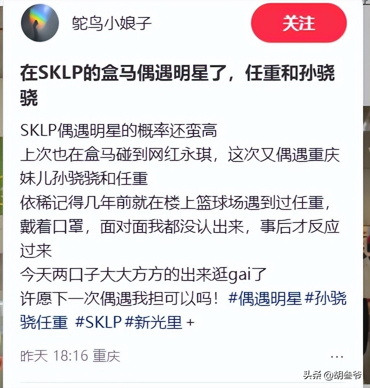 4月9日,多位网友在重庆SKLP商场的盒马超市撞见了任重和孙骁骁。