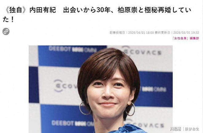根据日本公司公开记录,内田有纪(50岁)在柏原崇(49岁)担任代表的经纪公司“Ten Beans合同会社”中,业务执行社员名称已于2026年3月24日从“内田有纪”变更为“柏原有纪”,法律层面证实婚姻关系成立。