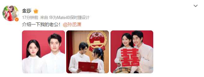 4月9日,演员金莎在微博晒出与孙丞潇结婚照,官宣两人结婚消息。