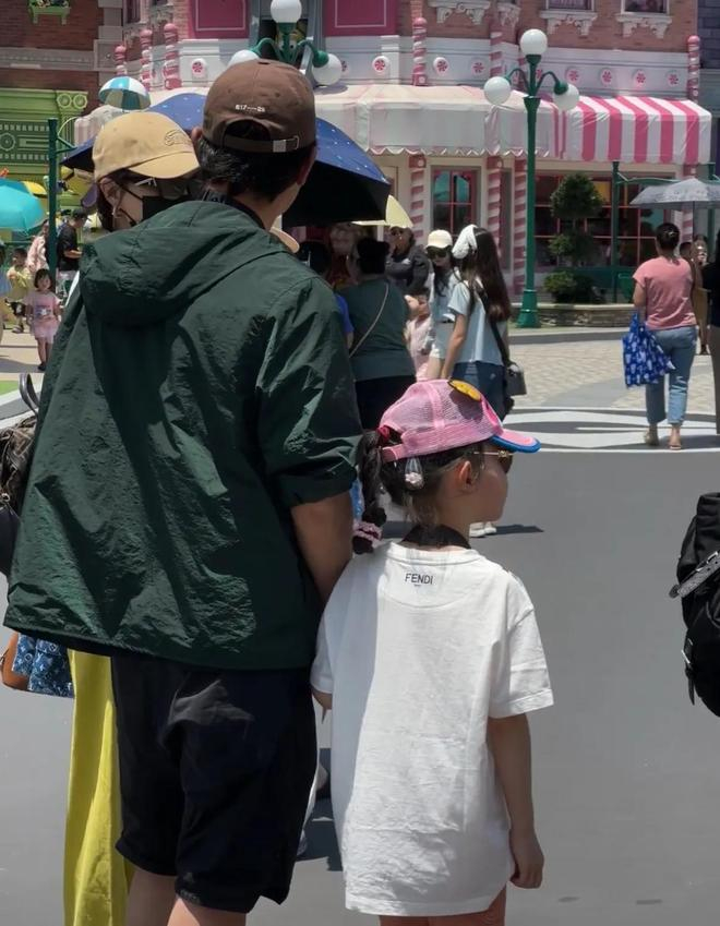 他们牵着女儿的手,一起往前走着。一家三口都戴着鸭舌帽,画面真的看起来好温馨啊!