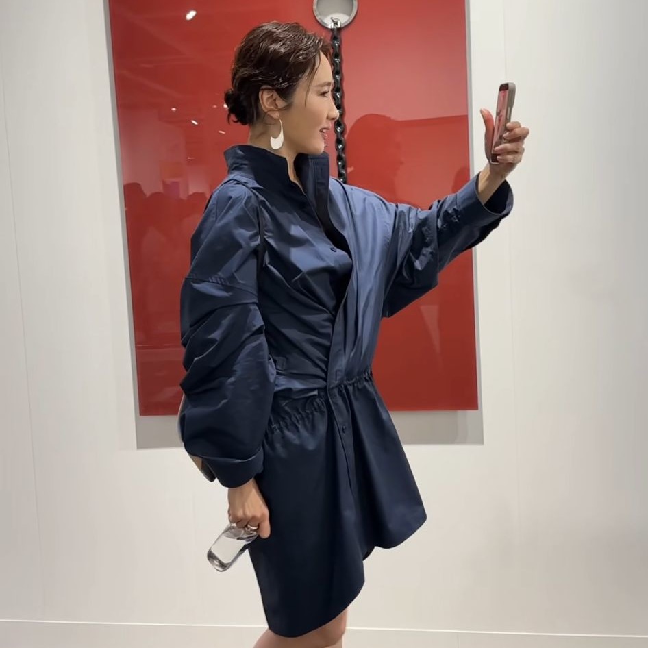 黎姿身穿深蓝色连衣裙,搭配同品牌的靴子,造型简约优雅。