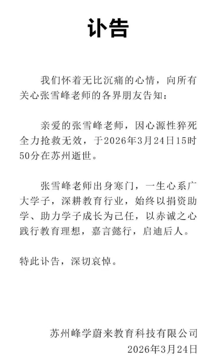 2026年3月24日,张雪峰突发疾病,第一时间送往医院抢救,医院全力施救,可病情恶化太快,没能留住他的生命。