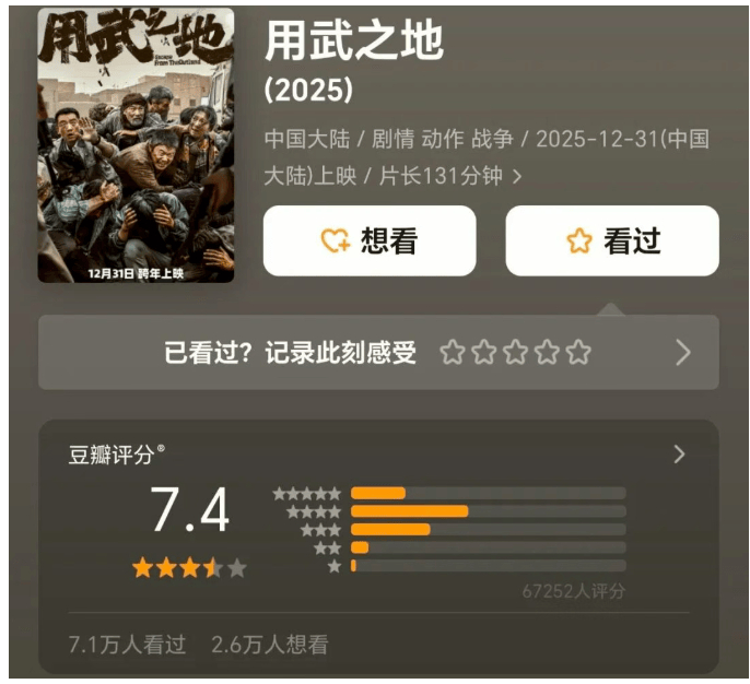 华语战争片市场,常常陷入“口碑与票房倒挂”的遗憾,而电影《用武之地》,无疑是近期最让影迷意难平的一部。这部聚焦战乱地带普通人绝境求生的现实主义战争片,豆瓣稳稳拿下7.4分,稳居同档期口碑前列,收获影评人与资深影迷的一致认可,最终票房却堪堪停留在7000万,连成本线都难以触及,堪称2025-2026年度最被严重低估的战争题材佳作。明明有扎实演技、硬核质感与深刻内核,却在市场遇冷,这份落差背后,是好片的无奈,也是观众的错过。