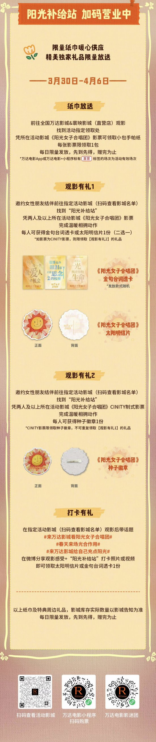 主题影片活动仪式感十足。吉林省内万达影城、寰映影城直营店同步开启影片专属活动。针对《阳光女子合唱团》,推出赠纸巾、互动打卡领透卡、明信片、种子徽章等福利;邀请女性朋友结伴观影,凭《阳光女子合唱团》影票完成拥抱互动,即可领取对应特典。在长春寰映影城摩天活力城店、长春万达茂店观影后,带活动指定话题分享真实观影感受及打卡照片,可免费领取金句透卡或明信片,数量有限,赠完即止。长春寰映影城摩天活力城店针对《超级马力欧银河大电影》开设IMAX、4DX专属场次,观影可兑换限定海报及海报套装。长影影城(中商世界里店)开设“欧气满满”专场,观众购票并在社交平台分享即可领取海报、盲袋等衍生品,提升观影趣味性。