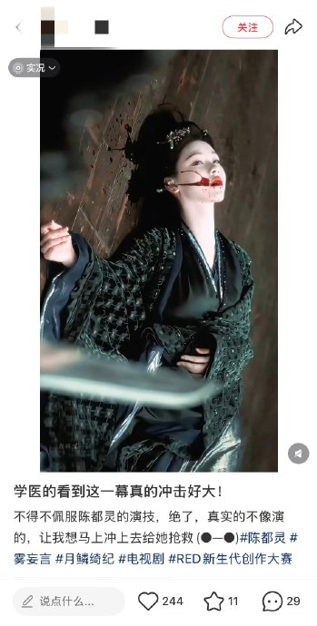 陈都灵在《月鳞绮纪》中饰演九尾狐大祭司雾妄言,其“吐血濒死戏”以极致真实的表演震撼观众,背后是她对角色近乎殉道式的付出——从生理极限的挑战到艺术细节的雕琢,每一帧绝望都是血肉的献祭。